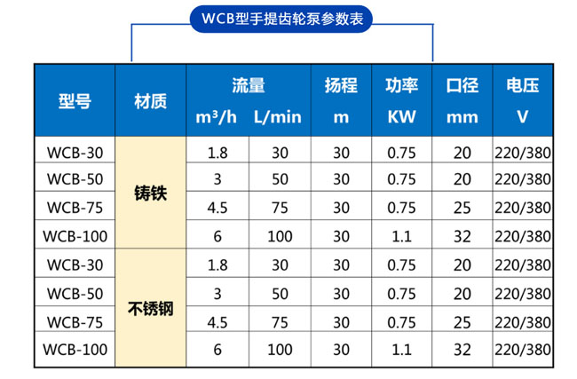 WCB便攜式手提油泵屬于低壓力微型手提式節(jié)能輸油泵,可使用220V電壓啟動(dòng),體積小,重量輕,并配有手柄方便用戶提在手中移動(dòng)。WCB便攜式油泵保養(yǎng)方便,性能可靠,使用壽命長,外觀簡潔 ,結(jié)構(gòu) 合理,采用國際標(biāo)準(zhǔn) ,可輸送液體不可含固體顆粒,輸送溫度不高于70℃ 。 適用于無動(dòng)力電源的出售單位油桶軸油,也適用于煉油廠、電廠、電站、變電所(室)及油庫輸油。稀油潤滑系統(tǒng)的稀油轉(zhuǎn)運(yùn)。